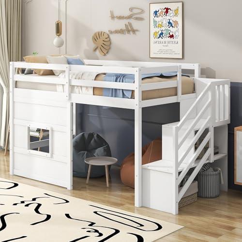 Wood Loft Bed with Storage Staircase and Window,No Box Spring Required, Twin Size, White
