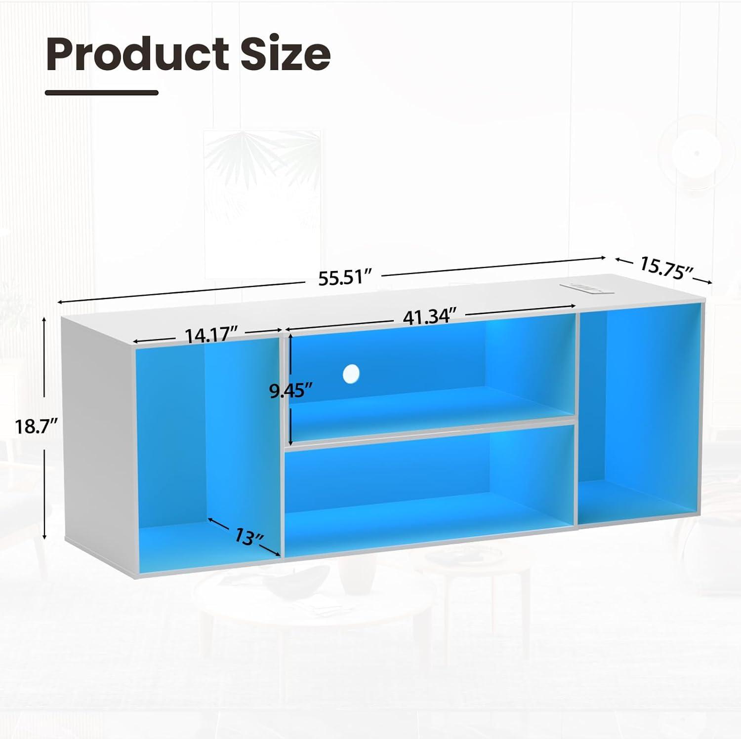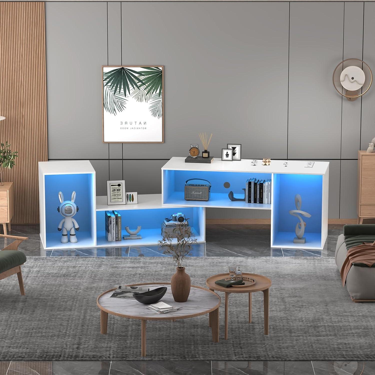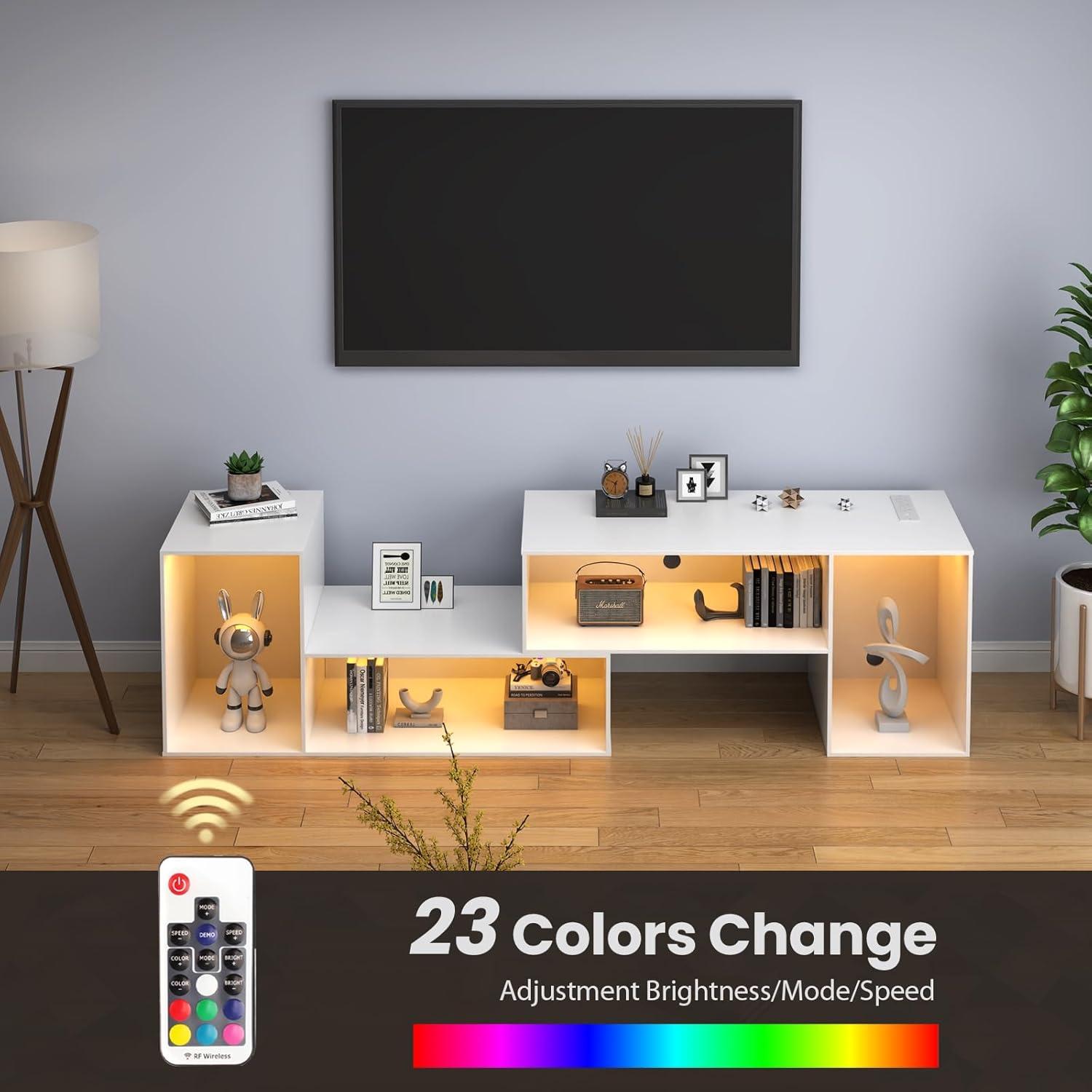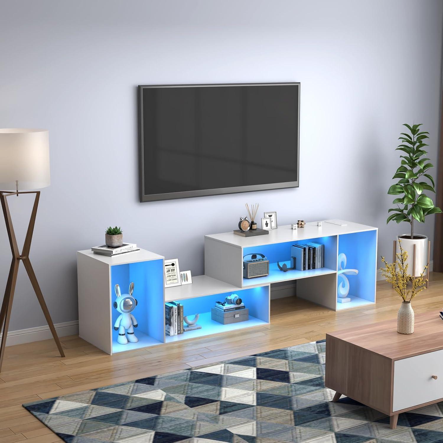 you catch it before the TV itself — a soft ribbon of color pooling along the floor from a low white console. The listing calls it “Deformable TV Stand with LED Lights, Living Room TV Stand with Power Outles & USB Ports, Game Console Entertainment Centre with Storage Shelves and Media Layers for 70 inches TVs (White),” but here it reads simply as a modular, lighted media bench. Up close the engineered wood top is cool under your hand, the matte laminate showing a faint grain and seams that speak more of flat-pack assembly than handcrafted joinery. Its stepped shelves break the visual mass into layers, and the built-in outlets and USB ports sit recessed enough to keep cables mostly out of sight. When the leds come on, the color washes soften the edges and change how the white plays against the wall, giving an otherwise ordinary unit a quietly theatrical presence.