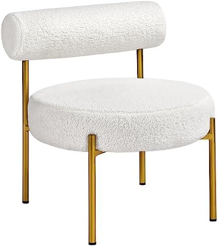 This stylish accent chair combines contemporary design with comfort, elevating the aesthetics of any living space. The distinctive cylindrical back and round seat are enveloped in luxurious white boucle, complemented by foam padding for added comfort. Gold legs provide a touch of glamour, making it an eye-catching addition to bedrooms, living rooms, or home offices. The chair is designed for versatility; its armless structure allows for easy movement and casual seating arrangements, perfect for both intimate conversations and casual gatherings.