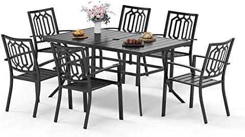 This stylish outdoor furniture arrangement offers a practical yet elegant solution for al fresco dining with family and friends. Featuring a spacious table measuring 60″ in length, the wood-like top creates a welcoming atmosphere for meals, while the sturdy black metal frame ensures durability against the elements. The six included stackable chairs provide comfortable seating and can be easily stored when not in use, making it ideal for those with limited outdoor space. The design includes an adjustable umbrella hole, enhancing the versatility for sunny days.