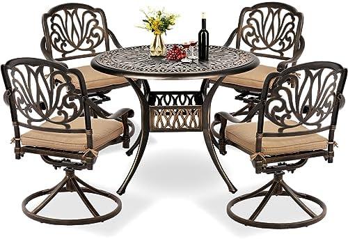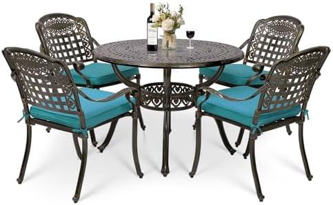 This beautiful outdoor dining collection combines style and functionality, featuring a sturdy cast aluminum construction that promises longevity and resistance to rust. Its all-weather design ensures it handles splashes from the pool and unexpected rain without showing any signs of wear, making it perfect for summer lounging or relaxing in the garden. The set includes a 35.4-inch round table with a convenient umbrella hole, enhancing its versatility for sunny days. The four swivel chairs allow for a 360-degree rotation, ensuring comfort and ease of movement, whether you’re dining or enjoying a drink with friends.