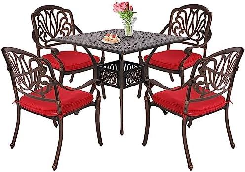 This outdoor furniture set brings an elegant touch to any space with its charming flower back design and antique bronze finish. Crafted from all-weather, rust-resistant cast aluminum, it promises durability while remaining surprisingly lightweight for portability. The set includes four ergonomic chairs that feature 2.7-inch padded cushions for added comfort, making it perfect for extended outdoor dining or entertaining. Additionally, the 35.4-inch square table includes a 2.4-inch umbrella hole, providing the options needed to enjoy a shaded area on sunny days. Its versatile design makes it an ideal fit for backyards, patios, gardens, or poolside gatherings.