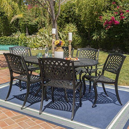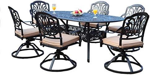 This elegant dining set features a combination of cast aluminum construction and an aesthetically pleasing design, making it a striking addition to any patio or outdoor space. The durable materials offer weather-resistance, ensuring longevity even in varying climatic conditions. The set comes with six swivel rockers, which provide comfortable seating and a smooth rocking motion, enhancing the experience of outdoor dining with friends and family. The intricate design of the table and chairs brings a touch of sophistication while still being functional for casual entertaining.