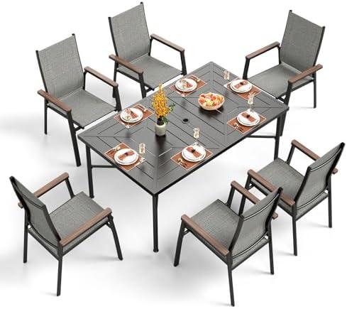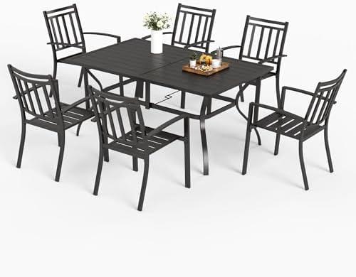 The outdoor furniture ensemble offers a modern and durable solution for your patio dining needs. Constructed from heavy-duty metal with an elegant black finish, this set is both rust and weather resistant. Its rectangular table features a sleek steel slat surface, and the included umbrella hole accommodates most outdoor umbrellas, providing shade for your gatherings. The six stackable chairs are designed to optimize storage space, making it easy to store when not in use. Additionally, this set is easy to maintain, requiring no special care to keep it looking its best.