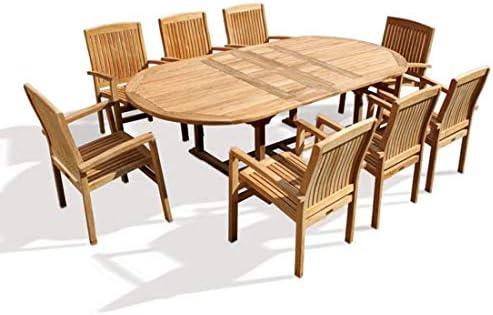 This exquisite outdoor dining set combines an elegant oval table measuring 95″x40″ with two extension features and eight Verona stacking chairs equipped with cushions, making it perfect for entertaining guests or enjoying family meals in the open air. The Grade-A teak wood not only offers a rich, warm appearance but is also known for its exceptional durability and weather resistance, ensuring that it will stand the test of time. The set allows flexibility in seating arrangements, accommodating various party sizes, while the stacking chairs are perfect for convenient storage when not in use.