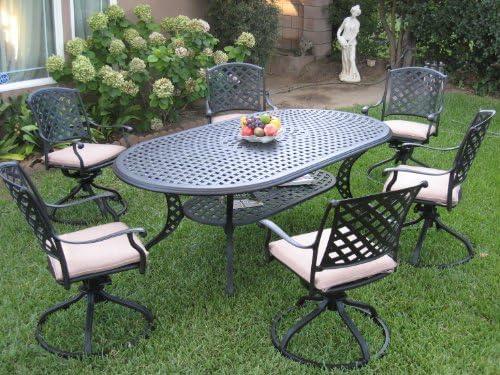 Experience the perfect blend of comfort and elegance with this exquisite outdoor dining arrangement. Featuring a spacious table complemented by six swivel rocking chairs, it allows for leisurely dining and casual gatherings. The sturdy cast aluminum material ensures durability against the elements, while the intricate design adds a touch of sophistication to any patio or backyard. The swivel feature of the rocking chairs provides easy movement, making it convenient for conversations or simply enjoying the surroundings.