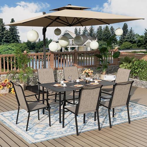 This versatile dining set transforms any outdoor area into an elegant gathering spot. Featuring a sturdy metal frame with e-coating technology, it resists rust and fading, ensuring durability against the elements. The table boasts a 67″ length, comfortably accommodating six people, while the breathable Textilene fabric chairs provide ultimate relaxation, supporting up to 300 pounds. A thoughtfully designed umbrella hole enhances outdoor dining by offering shade on sunny days, making this set perfect for gardens, lawns, patios, and poolside gatherings.