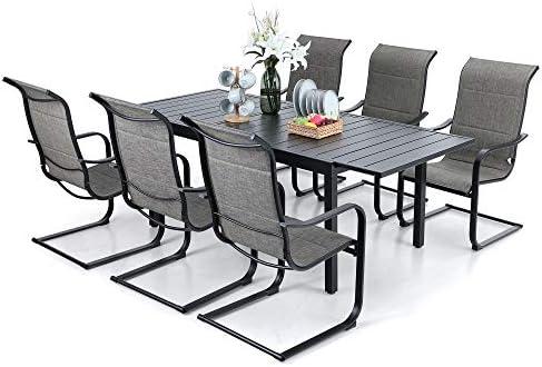 This versatile dining set accommodates 6 to 8 guests, thanks to its expandable slatted metal table design. Perfect for creating an inviting atmosphere, it enhances any patio or outdoor venue, making it the ideal choice for gatherings with friends and family. The high-quality C-spring chairs, featuring padded Textilene fabric, ensure comfort while providing a contemporary look. The breathable and waterproof materials are designed to withstand various weather conditions, ensuring durability throughout the seasons.