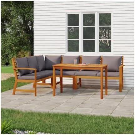 This outdoor dining set combines stylish design with practical functionality, making it an excellent addition to any patio. Constructed from solid Acacia wood with an oil finish, this set boasts sturdy construction that can withstand outdoor elements. The dark gray foam cushions provide comfort with back cushion dimensions of 21.3″ x 18.5″ x 5.9″, ensuring you can enjoy long meals with family and friends. Each piece is designed thoughtfully, with an armrest height of 23.6″ from the ground, accommodating various seating preferences. The table offers ample space for meals, drinks, and decorative items, enhancing your outdoor dining experience.