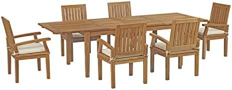 The overall dimensions of the set are well-planned for gatherings, with a table measuring 39.5″L x 108.5″W x 30.5″H and chairs at 24.5″L x 24.5″W x 37.5″H, providing ample space without overcrowding. To keep the stunning look and integrity of the teak, regular maintenance such as light sanding and applying a teak cleaner is recommended. This not only maintains the wood color but helps it withstand wear and tear while looking fresh season after season.
