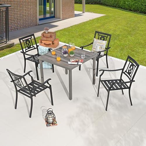 This outdoor dining set combines style and functionality, featuring four stackable chairs and a square bistro table. Crafted from durable powder-coated steel, it promises stability and longevity, making it ideal for outdoor settings like backyards, decks, and gardens. The set’s modern design, with elegant armrests and a slightly inclined backrest, offers comfort while accommodating various occasions, whether entertaining guests or enjoying a quiet meal. The stackable chairs facilitate easy storage, ensuring they won’t take up too much space when not in use.