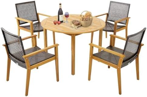 Outdoor Dining Set Featuring 4 Wicker Chairs and Round Wooden Table