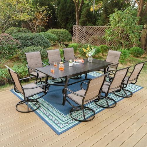 Experience the blend of style and functionality with this outdoor dining set, featuring an extendable table that can accommodate 4 to 8 people. The table is constructed with high-density steel that ensures durability and longevity, while its powder-coated finish offers excellent resistance against rust and corrosion. The 360-degree swivel dining chairs enhance mobility and comfort, allowing you to converse easily with your guests. Ergonomic features like the high back and padded design help alleviate back pain, making it suitable for extended gatherings.