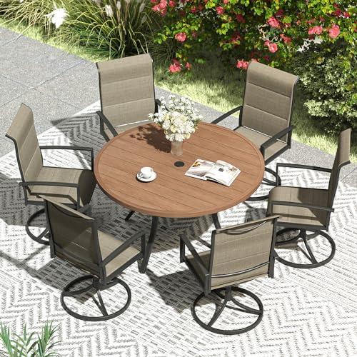 This outdoor dining set includes a beautifully crafted round table with a walnut wood-like finish and six 360-degree swivel chairs, all designed to elevate your outdoor dining experience. The 47.2-inch table is not only aesthetically pleasing but also highly functional, featuring a hand-polished surface that resists cracking and burning, making it ideal for all-season use. The chairs incorporate breathable sling fabric with fast-dry foam, ensuring comfort and ease during warm days while providing a solid base for stability. Additionally, the set’s rust protection, achieved through electrophoresis technology, enhances durability, making it a reliable choice for daily use in various weather conditions.
