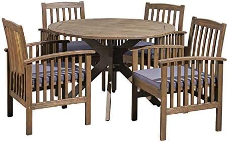 This outdoor dining arrangement combines aesthetic charm and practical features, making it a perfect fit for your patio gatherings. Crafted from durable acacia wood, it showcases a weather-resistant finish that ensures longevity. The dining set consists of a round table with unique X-shaped legs and four comfortable chairs adorned with dark gray, water-resistant cushions. With dimensions that offer ample seating while maintaining a compact design, this set is ideal for a variety of outdoor spaces. The set is easy to maintain and complements any outdoor décor due to its modern yet transitional design.