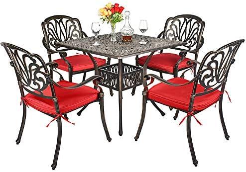 This outdoor dining set is crafted from durable cast aluminum, built to withstand the elements and resist rust over time. The blooming flower design on the chairs adds a touch of elegance, making it suitable for any outdoor setting, be it a patio, garden, or poolside. Each chair is designed for comfort, featuring contoured shapes and curved armrests. With dimensions of 35.4 inches for the square table and 25.6 inches for the chairs, it offers ample space for dining and relaxation. The set includes a convenient umbrella hole, allowing you to insert a patio umbrella easily, providing shade during sunny days.