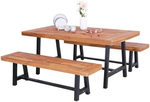 Constructed from 100% premium acacia wood, this outdoor dining collection is designed to bring both durability and style to your porch or backyard. The oil-finished tabletop not only enhances the natural beauty of the wood but also provides protection against water damage, making it suitable for occasional outdoor use. The spacious table dimensions (67.7″L x 35.4″W x 29.7″H) can accommodate 6 to 8 guests comfortably, while the benches (63.0″W x 14.4″D x 17.9″) boast a substantial load capacity of over 500 pounds, perfect for gatherings or casual family dinners. However, to maintain its longevity, the furniture should not be exposed directly to sun or rain, making it advisable to cover or store the pieces when not in use.