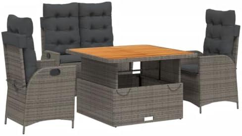 This outdoor dining set is an excellent addition to any garden, backyard, or patio, offering a sophisticated yet functional space for socializing or dining outdoors. Crafted from durable PE rattan, also known as poly rattan, it mimics the look of natural materials while providing weather resistance and low maintenance. The adjustable backrest and tabletop make it versatile; whether you’re enjoying coffee in the morning or hosting a dinner party, the reclining bench and two chairs can easily transition to suit your needs. Thickly padded cushions enhance comfort, ensuring long hours can be spent relaxing in this cozy setup.