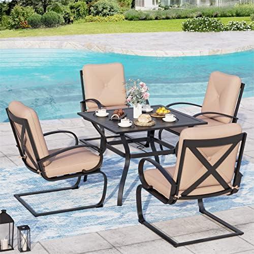 Transform your outdoor space into a charming dining area with this sophisticated set. Featuring a square bistro table paired with four metal spring motion dining chairs, this combination offers both elegance and comfort. The powder-coated steel frame enhances durability, making it resistant to rust and weather elements. With dimensions including a table size of 37″L x 37″W x 28″H and chairs that can accommodate up to 350 lbs, this set is perfect for family gatherings or intimate dinners. Additionally, the ample 1.57″ umbrella hole in the table ensures you can enjoy your meals with shade on hot days.