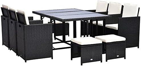 This outdoor dining set is designed with practicality in mind, offering a spacious arrangement for up to ten people. The six cushioned chairs and four ottomans nestle neatly under the large tempered glass table when not in use, allowing for efficient space-saving and protection from the elements. Crafted with water-resistant PE plastic rattan and galvanized steel frames, the furniture demonstrates exceptional durability against weathering and rust. The thick padded cushions also ensure comfort during long outdoor gatherings, while their removable covers make cleaning a breeze.