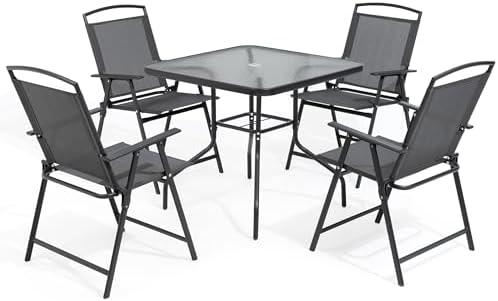 This outdoor dining furniture set features a durable and rust-free steel frame coated for longevity, making it an excellent choice for gardens, backyards, or patios. The elegant square glass tabletop not only adds a sophisticated touch but also provides easy maintenance due to its tempered glass surface, while the included umbrella hole makes it easy to enjoy shade on sunny days. The foldable seating enhances convenience, allowing you to store and transport the chairs effortlessly, while rounded edges ensure that safety is prioritized during your outdoor gatherings.