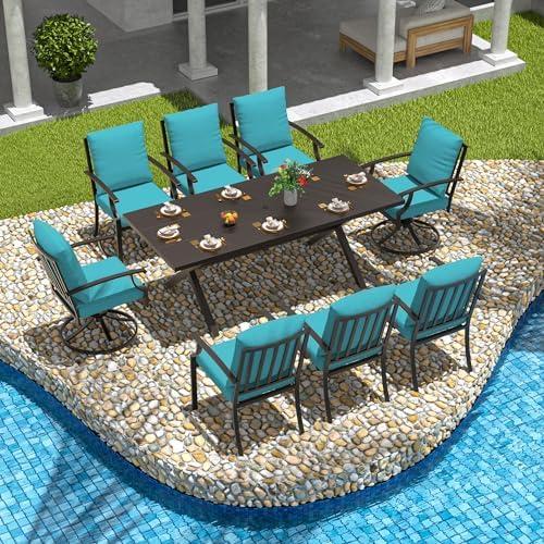 This outdoor dining set seamlessly blends style and functionality with its elegant design, featuring eight swivel rocker chairs complemented by a spacious table. Crafted from heavy-duty steel, the durable frames ensure longevity and resistance against rust and harsh weather conditions. The table measures 84 inches by 42 inches, providing ample space for family gatherings or entertaining friends. Each chair is outfitted with plush, 4-inch cushions, ensuring comfort during prolonged outdoor dining experiences. The quick-dry fabric is designed to withstand moisture and UV rays, making it ideal for outdoor settings.