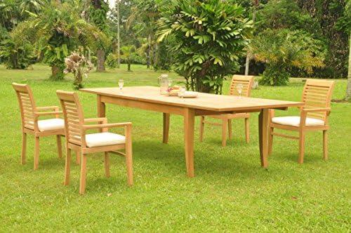 This dining arrangement features a beautiful rectangular table made from Grade-A teak wood, known for its durability and resistance to weathering. The table measures 83 inches but can be effortlessly extended to 122 inches, providing ample space for gatherings. With a height of 31.5 inches, it comfortably accommodates diners. The set includes four stacking arm chairs that offer both comfort and convenience, making them ideal for easy storage. Each chair is fully assembled and complements the table’s aesthetics, making your dining space both functional and elegant.