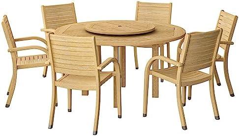 Crafted from 100% FSC certified eucalyptus wood, this patio dining arrangement combines sustainability with superior durability. The light brown-teak finish not only enhances its aesthetic appeal but also provides natural resistance to rot and weathering, ensuring it stays looking great throughout the seasons. The set includes a round table featuring a 31-inch lazy Susan and six chairs, making it perfect for family dinners or outdoor gatherings. The table’s dimensions are 59 inches in diameter and 36 inches in height, while each chair can support up to 250 lbs, providing both comfort and stability for guests.