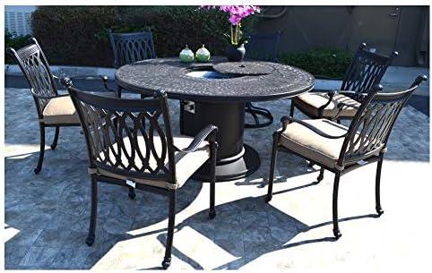 While the set stands out for its stylish design and durability, there are some factors to consider. The swivel rockers add a touch of luxury but may require more space than traditional chairs. Also, while the fire pit feature is a great addition for ambiance, it could pose a risk for families with small children or pets. this dining set merges elegance with functionality, serving as an excellent centerpiece for outdoor dining experiences. For those looking to elevate their garden or patio, this set is a fantastic investment that combines aesthetic charm and practicality.