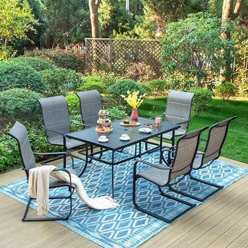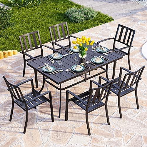 This outdoor dining furniture set offers a perfect blend of style and comfort, making it an excellent addition to your garden or backyard. It features a 64″ rectangular table crafted from rust-resistant steel, combined with a beautifully designed faux woodgrain finish that adds warmth and sophistication to any outdoor setting. The six cushioned chairs are made with durable Teslin fabric, ensuring they are not only comfortable but also resistant to oil, water, and UV rays. With a weight capacity of 350 lbs for each chair, this set accommodates a variety of guests, allowing everyone to enjoy al fresco dining without worry.