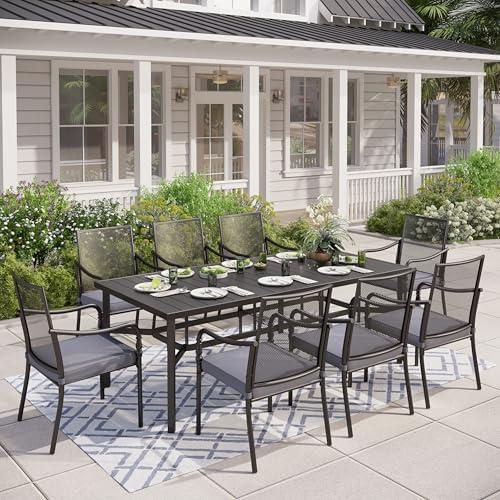 However, potential buyers should consider a few drawbacks. The set’s larger size might not be suitable for smaller spaces, and assembly may require some time and effort despite clear instructions provided. Another consideration is the need for protective covers or storage during harsh weather to prolong the life of the metal finishes. this dining set strikes a balance between aesthetic appeal and practical functionality, perfect for hosting outdoor meals.