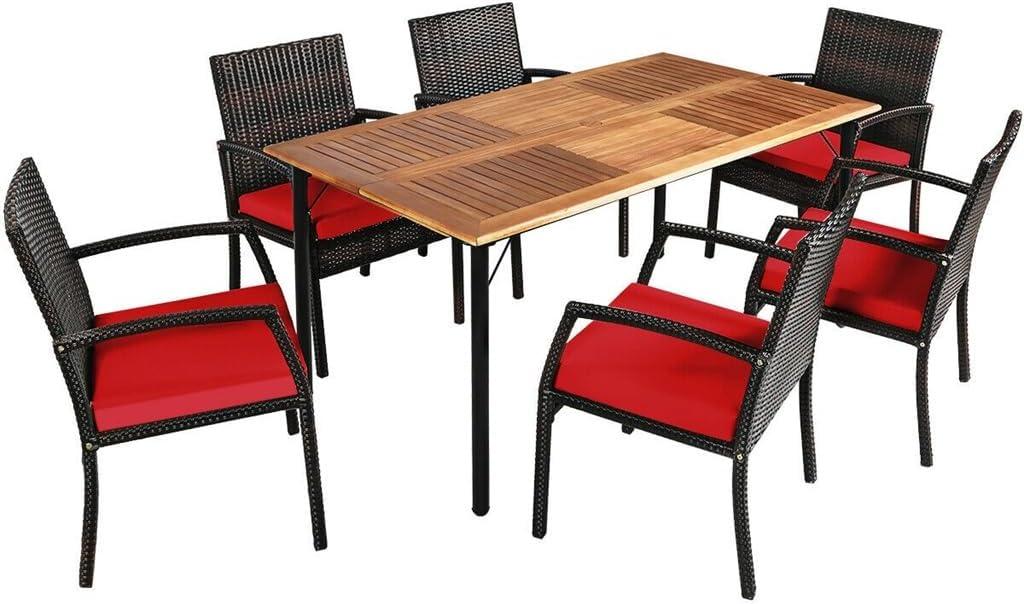 7PCS Patio Rattan Dining Chair Table Set W/Cushion Umbrella Hole Red