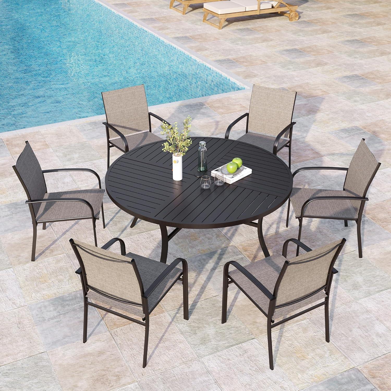 This extensive patio dining arrangement includes a 54″ round table accompanied by six chairs,ensuring you have ample seating for family gatherings or entertaining friends. The design is tailored for various outdoor settings, from backyards to poolside, while the anti-rust coated steel frame offers durability against the elements. The breathable Textilene fabric used in the chairs adds a layer of comfort, helping to alleviate muscle tension during long periods of sitting.With properties like being water-repellent, soil-release, and UV resistance, this set is ideal for those looking to invest in outdoor furniture that is both stylish and practical.