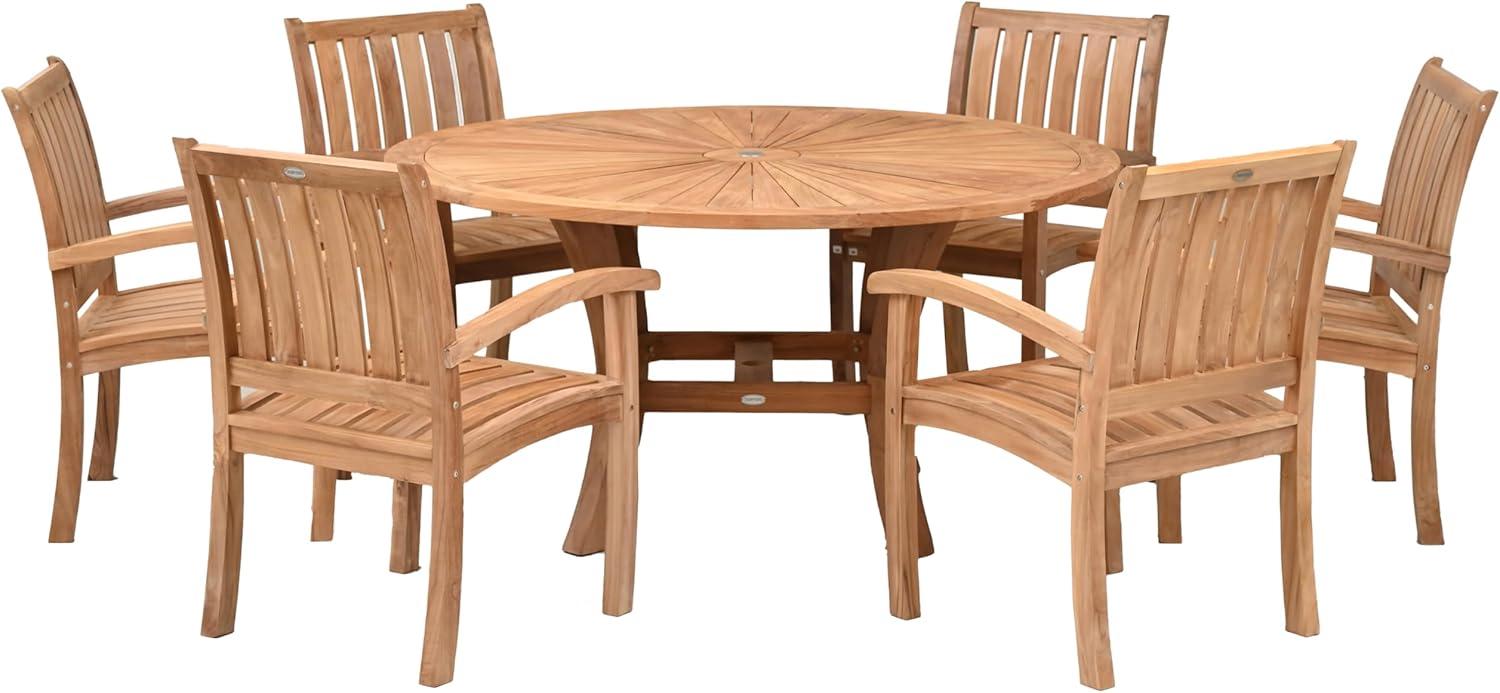 Crafted from A-grade, sustainably sourced teak wood,this dining set offers an extraordinary blend of elegance and functionality. The 59-inch round table features a beautiful honey-brown finish,making it a focal point for any outdoor setting. With its sturdy construction, this piece is designed to withstand various weather conditions, ensuring long-lasting use, whether in your garden, on a patio, or in a sunroom. The set is not only visually appealing but also practical, featuring stainless steel hardware and an umbrella hole for those sunny days.each of the six Abacho side chairs, carefully handcrafted by skilled artisans, provides comfort and style.