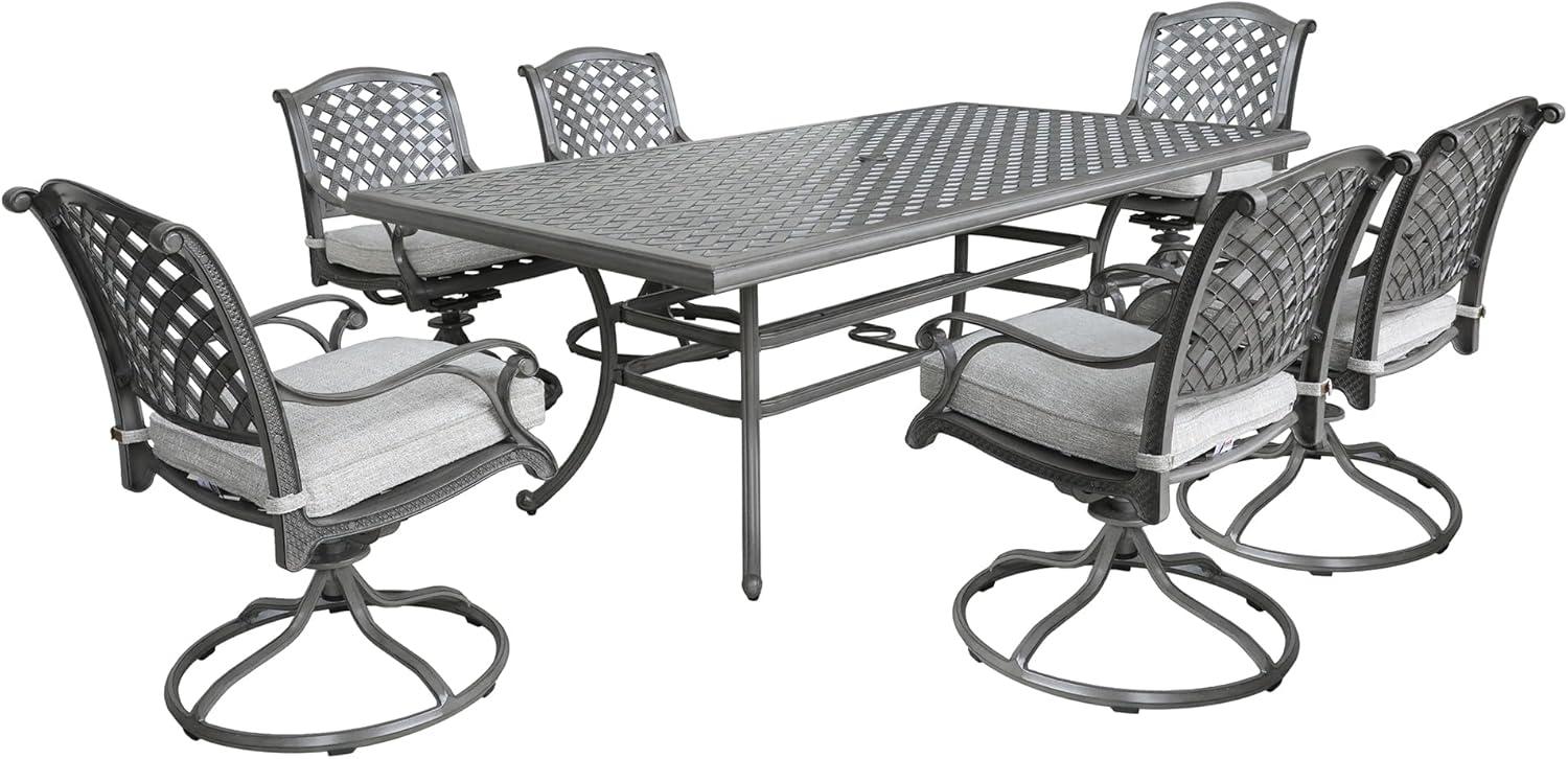 Elevate your outdoor dining with a beautifully crafted set featuring durable and weather-resistant aluminum construction. This 7-piece arrangement includes six swivel chairs that provide both comfort and elegance with their plush, cushioned seats made from resilient foam and durable polyester fabric. The classic lattice-patterned seat backs contribute a elegant touch to any patio space,while the spacious rectangular table allows ample seating for gatherings with family and friends.Assembly is straightforward thanks to the included instructions and hardware, ensuring you can quickly set it up and enjoy leisurely meals outside.
