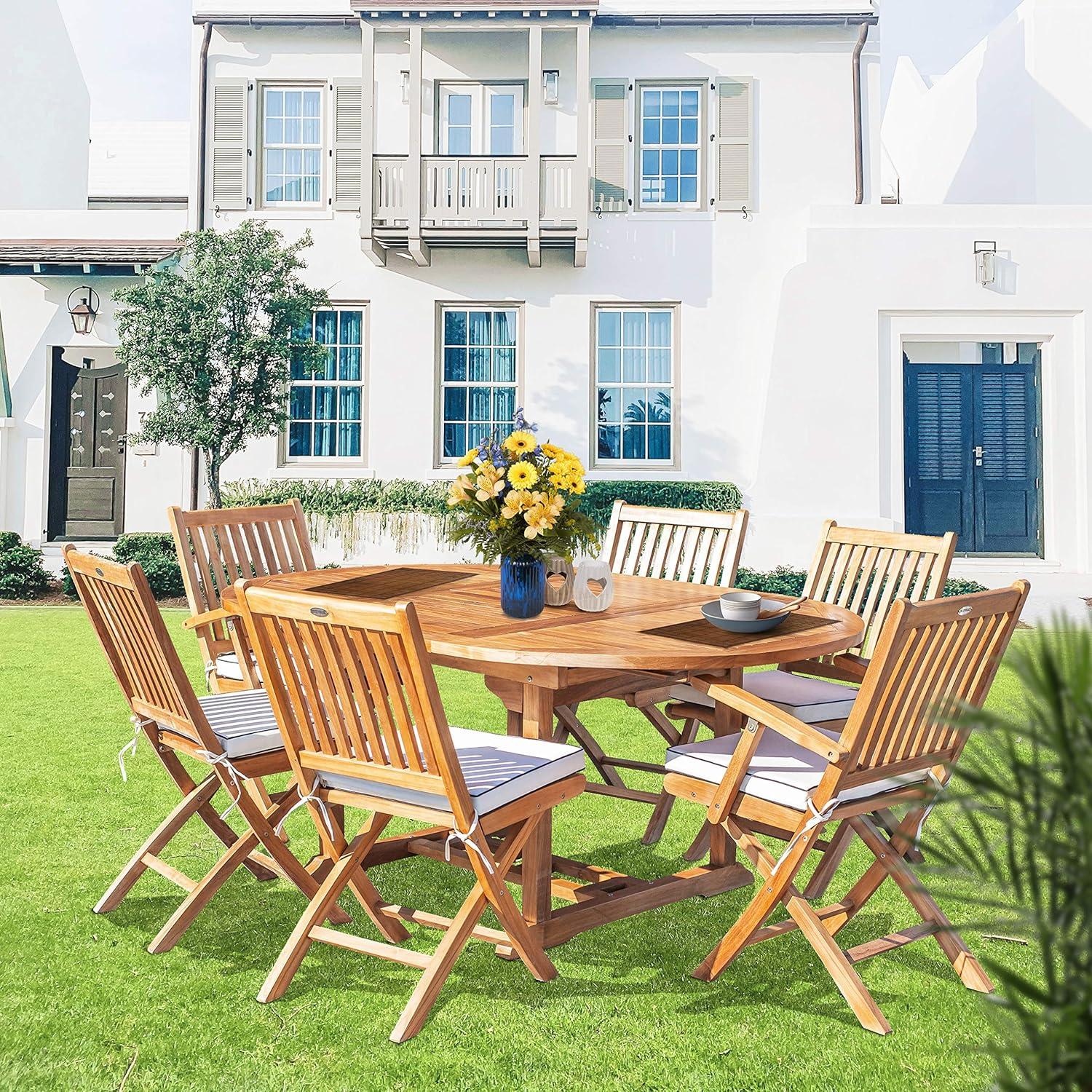 This exquisite patio dining set boasts a stunning round to oval extension table, complemented by two arm chairs and four side chairs, all adorned with plush cushions. Designed with solid A-Grade teak wood, this set stands out for its durability and resistance to the elements, ensuring your investment lasts through countless outdoor gatherings. The table elegantly expands from a cozy 47 inches to a spacious 71 inches,making it perfect for both intimate breakfasts and lively dinner parties under the stars. Moreover, the lightweight folding chairs add to the convenience, allowing for easy storage and versatile placement around your outdoor space.Pros: