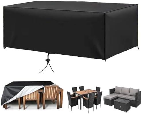 This covers provides reliable protection for outdoor furniture, featuring dimensions that accommodate a variety of furniture styles including rattan tables and chairs. Made from heavy-duty 420D oxford fabric, it is designed to be waterproof and weatherproof. The windproof design includes four corner buckles and an adjustable cord that ensures the cover remains securely in place, even in windy conditions. Its ability to withstand rain, snow, sun, and dirt makes it an excellent choice for year-round use. Moreover, its universal fit allows it to suit different furniture pieces, making it versatile for various outdoor setups.