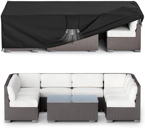 This cover accommodates large patio furniture sets measuring up to 108 inches in length, ensuring a snug fit for 8-10 seat tables and sectional sofas. Made from rip-resistant Oxford fabric, it showcases exceptional waterproof capabilities thanks to its PU coating and pressure-glued seams that protect against harsh weather elements like rain, wind, and snow. The design includes four click-close straps and two bottom drawstrings, keeping the cover secure even in windy conditions. An extra-large air vent promotes ventilation, preventing moisture buildup and ensuring cushions remain dry, contributing to the longevity of your outdoor furniture.