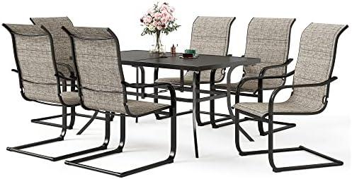 This outdoor dining set promises both style and durability, featuring a sleek black metal table with a slatted design and six ergonomic chairs made from upgraded weather-resistant Textilene fabric. The chairs boast a high-back for exceptional neck and spine support, ensuring a comfortable experience during long outdoor meals. The set’s table comes equipped with dual umbrella holes, facilitating flexible shade options for sunny days, while its sturdy steel frame can withstand various weather conditions.