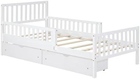This twin platform bed offers a delightful blend of style, functionality, and durability. Crafted from premium pinewood, plywood, and MDF, it boasts a sturdy frame that supports a weight capacity of 300 lbs, making it suitable for both children and teenagers. The design features a cute headboard and embraces a clean white finish that can easily complement any bedroom decor. With dimensions of 77.4″ L x 40.8″ W x 35.4″ H, it is compact yet spacious enough for comfortable sleeping. The bed includes two large drawers under the frame, providing ample storage for sheets, pillows, and other essentials, which helps to maximize bedroom space.