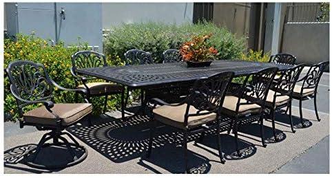 Featuring a robust cast aluminum build, this outdoor dining set is designed to bring elegance and comfort to your patio. With a generous extension capability, the table can accommodate large gatherings, stretching from 48” to an impressive 132”, making it perfect for barbecues or family gatherings. The five-stage powder-coated finish enhances durability, providing a rust-free experience in all weather conditions. With 8 dining chairs and 2 swivel rockers, this set is not only visually appealing but also sturdy, capable of withstanding strong coastal winds while providing comfortable seating for up to 10 guests.