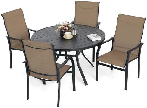 This patio dining set offers a harmonious mix of style and practicality, featuring a sturdy steel frame with powder-coating for enhanced durability and resistance to rust and weather. The design includes a large round dining table equipped with a 1.6″-1.9″ umbrella hole, allowing for versatile shading options. Each of the four textilene chairs is designed with ergonomic wide armrests and a unique striped pattern, providing a comfortable and breathable seating experience perfect for spring, summer, and fall. The overall construction ensures that even heavy individuals will find comfort and stability, as the table holds up to 300 pounds and the lightweight chairs weigh just 11 pounds each.