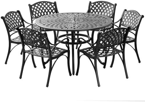 This stylish bistro set comprises a 48-inch round table and six comfortable chairs, crafted from high-quality cast aluminum. The materials are designed to endure various weather conditions, featuring a rust-proof and weather-resistant coating that enhances durability. With a maximum table capacity of 350 pounds and a chair capacity of 300 pounds, it offers stability and robustness essential for outdoor dining. Accompanying features include adjustable foot pads that ensure perfect stability and protect your floors from scratches, while the ergonomic design of the chairs alleviates fatigue, allowing for long hours of comfortable seating.
