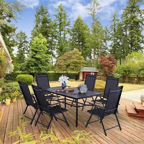 This versatile outdoor dining arrangement features a spacious metal table measuring 59″ x 35.4″, equipped with a convenient 2.6″ umbrella hole for shade on sunny days. The lightweight, foldable aluminum chairs can accommodate up to 250 lbs, providing a comfortable dining experience with seven adjustable reclining positions. The black metal stripe tabletop is both easy to clean and durable, making it suitable for all weather conditions. With its no-assembly required design, this dining set delivers effortless set-up and storage, allowing you to focus on enjoying your outdoor leisure time.