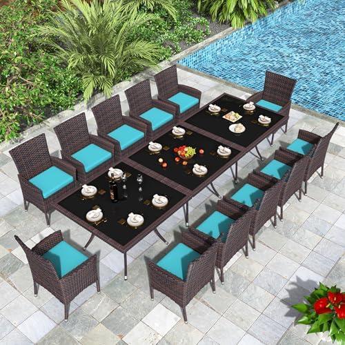 This 15-piece ensemble includes a spacious dining table paired with 12 comfortable chairs, all designed for enjoyable outdoor gatherings. Featuring soft cushions, the chairs provide a cozy seating experience, allowing you to relax while dining or entertaining. The table boasts a stylish square glass top with a convenient umbrella cutout, ensuring you can easily add shade on sunny days for extra comfort. Crafted from high-quality rattan, the set is built to withstand the elements, offering durability and longevity for your outdoor space.