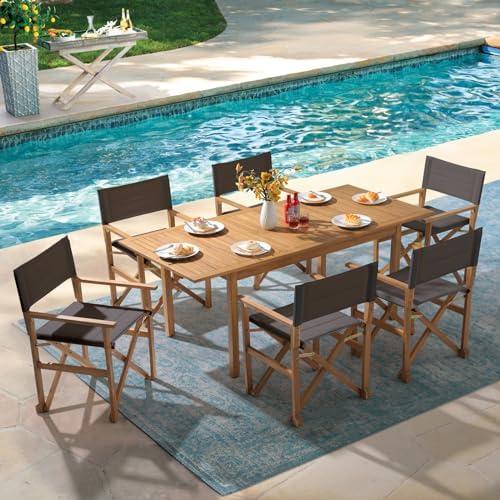 This beautifully designed patio dining set is made from sustainable acacia wood and offers both functionality and aesthetic appeal. The extendable rectangular table can effortlessly expand from 59″ to 79″, making it ideal for accommodating gatherings, whether large or small. The set includes six folding director chairs with soft padding for ultimate comfort, allowing users to enjoy meals outdoors without sacrificing relaxation. Equipped with adjustable feet, the table maintains balance on uneven surfaces, enhancing stability during use. The weather-proof finish ensures durability, enabling the furniture to withstand various weather conditions while retaining its elegance.