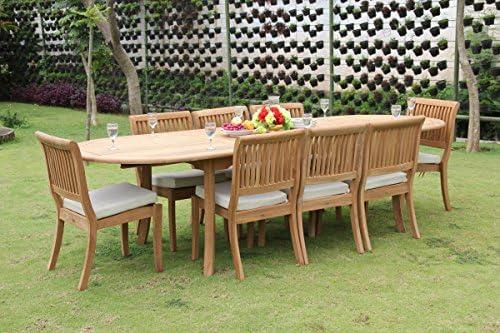 Comfort and elegance meet functionality with this outdoor dining ensemble. The set features an oval dining table that can extend from an initial 82 inches to a generous 117 inches, accommodating gatherings of family and friends. The eight stacking armless chairs provide both style and comfort, ensuring everyone enjoys their dining experience. Made from solid Grade-A teak wood, this furniture not only boasts a stunning natural look but also guarantees durability thanks to its robust construction and secure glued mortise and tenon joints. The thoughtful design includes a 2-inch umbrella hole for sun protection, complete with a lid for when it’s not in use.