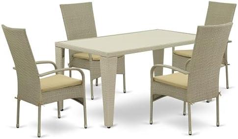 This elegant outdoor set features a rectangle dining table topped with glass and four cushioned armchairs. Designed for both beauty and comfort, the chairs offer a supportive structure made from lightweight steel and are draped in durable resin wicker, ensuring they stand up to the elements while maintaining a chic look. The plush cushions are water-resistant and easy to clean, making them ideal for outdoor environments. This combination provides an inviting place for meals, gatherings, or relaxation, appealing to families and entertainers alike.
