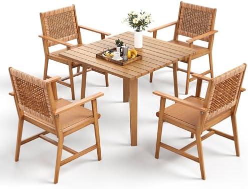 This elegant outdoor dining arrangement features a square table and four beautifully designed chairs, perfect for alfresco meals with family and friends. Crafted from premium acacia wood, the set not only boasts a natural and stylish appeal but is also built to withstand the elements, ensuring durability and weather resistance for years of use. The table’s dimensions at 40.15 inches each side offer ample space for dining, while the ergonomic design of the chairs, equipped with well-woven rattan, provides optimal support, enhancing comfort during long gatherings.