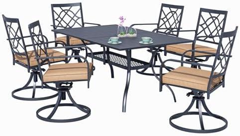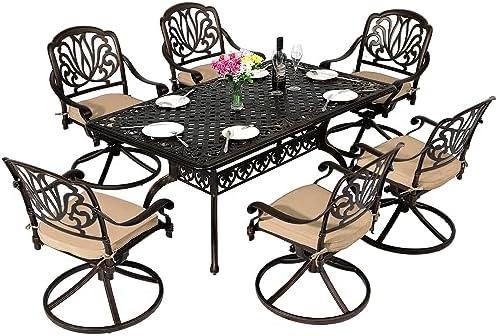 This stunning patio dining set combines robust cast aluminum material with an elegant design that enhances any outdoor space. Featuring six swivel rocker chairs adorned with floral patterns and cozy khaki cushions, this set is both inviting and stylish. Ergonomically designed backrests and comfortable handrails help reduce muscle tension, ensuring that you and your guests remain relaxed during meals or conversations. Additionally, the table includes a 2-inch diameter umbrella hole, making it easy to shield yourself from direct sunlight on those warm summer days.